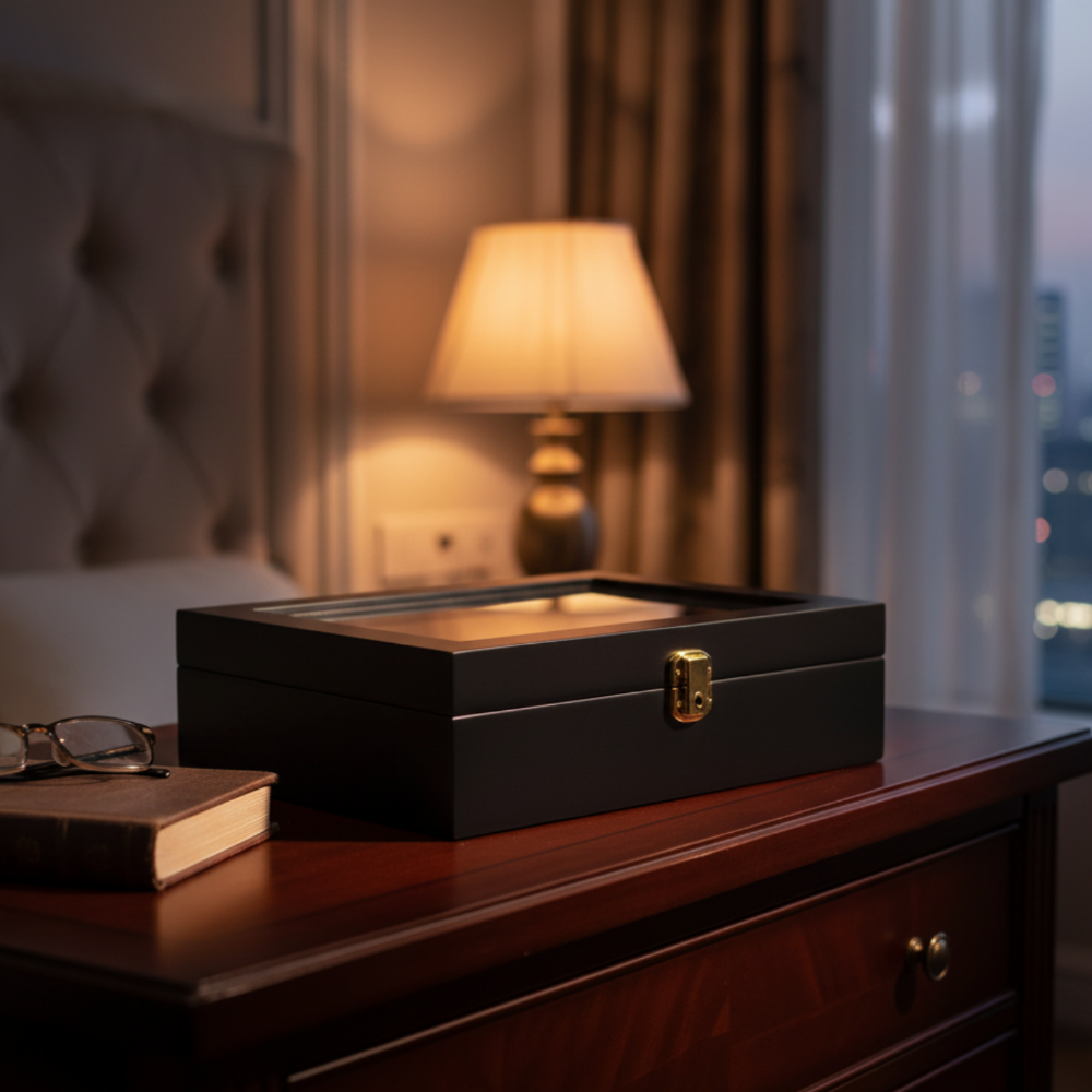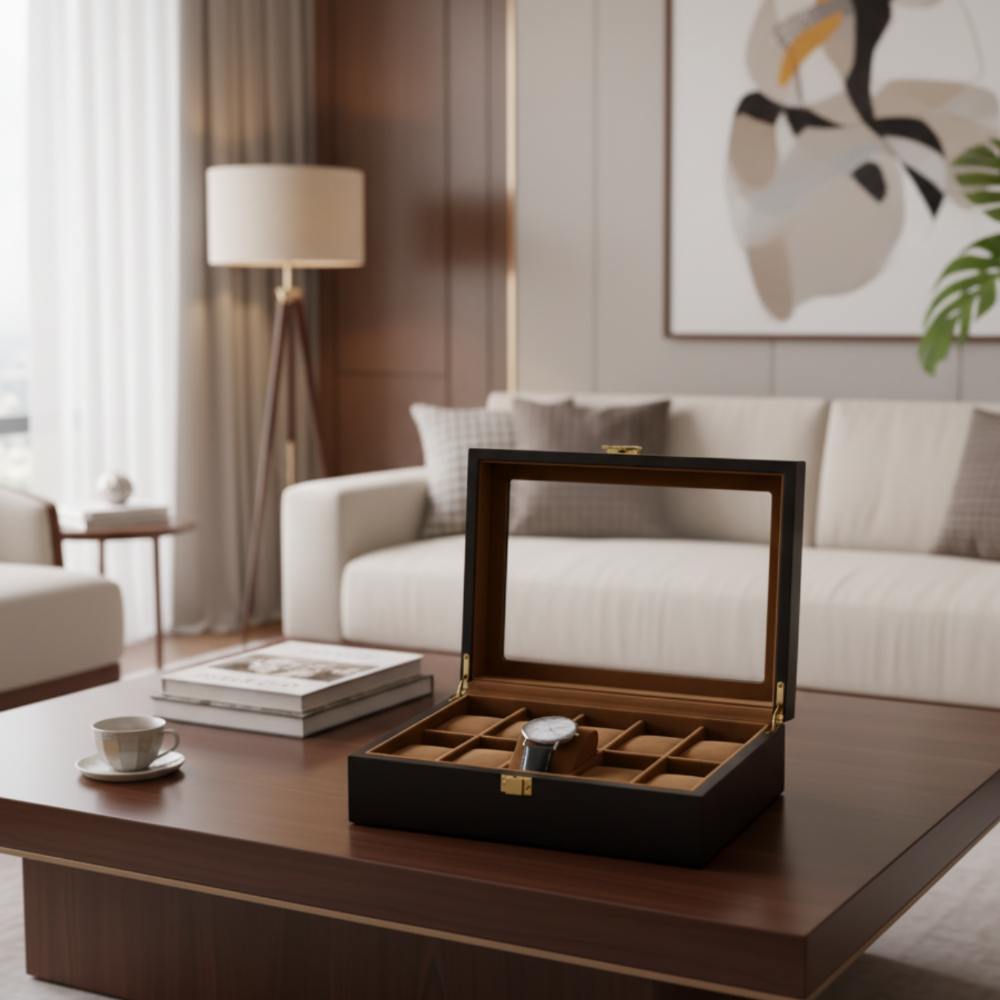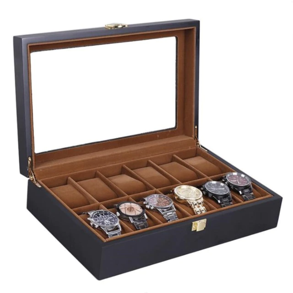 Découvrez l'écrin idéal pour votre collection horlogère avec notre boîte à montres de luxe. Conçu en bois, ce rangement sophistiqué offre 6, 10, 12  emplacements spacieux, doublés d'un intérieur en velours brun doux, assurant une protection optimale contre les rayures et la poussière. Son couvercle en verre transparent permet d'admirer instantanément vos pièces préférées tout en les préservant. Alliant fonctionnalité et esthétique, cette boîte n'est pas seulement un accessoire de rangement, mais une véritable pièce décorative qui mettra en valeur chaque montre, affirmant ainsi votre passion pour l'horlogerie avec beauté et distinction.
